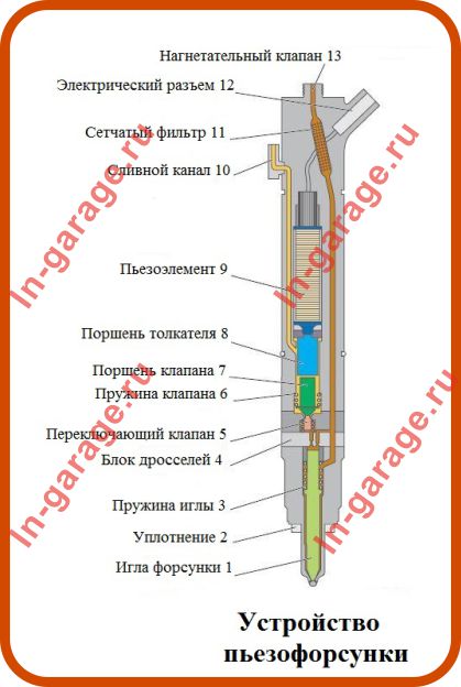 Устройство пьезоэлектрической форсунки наглядно изображено на картинке и включает в себя следующие элементы: