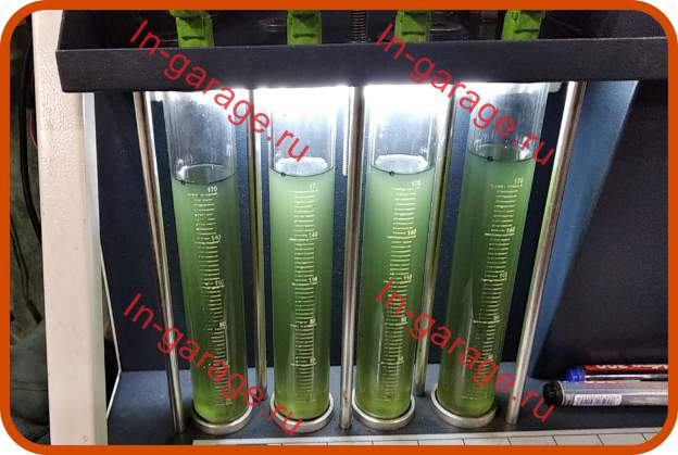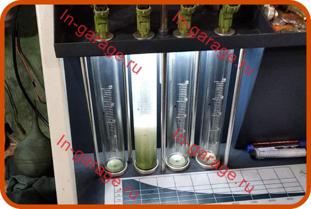 После промывки в ультразвуковой ванне распылитель ставим на стенд. На оригинале наблюдаем зауженный распыл, при этом наполнение по дебету у всех вполне приемлемое, что говорит об эффективности промывки и выравнивания производительности.